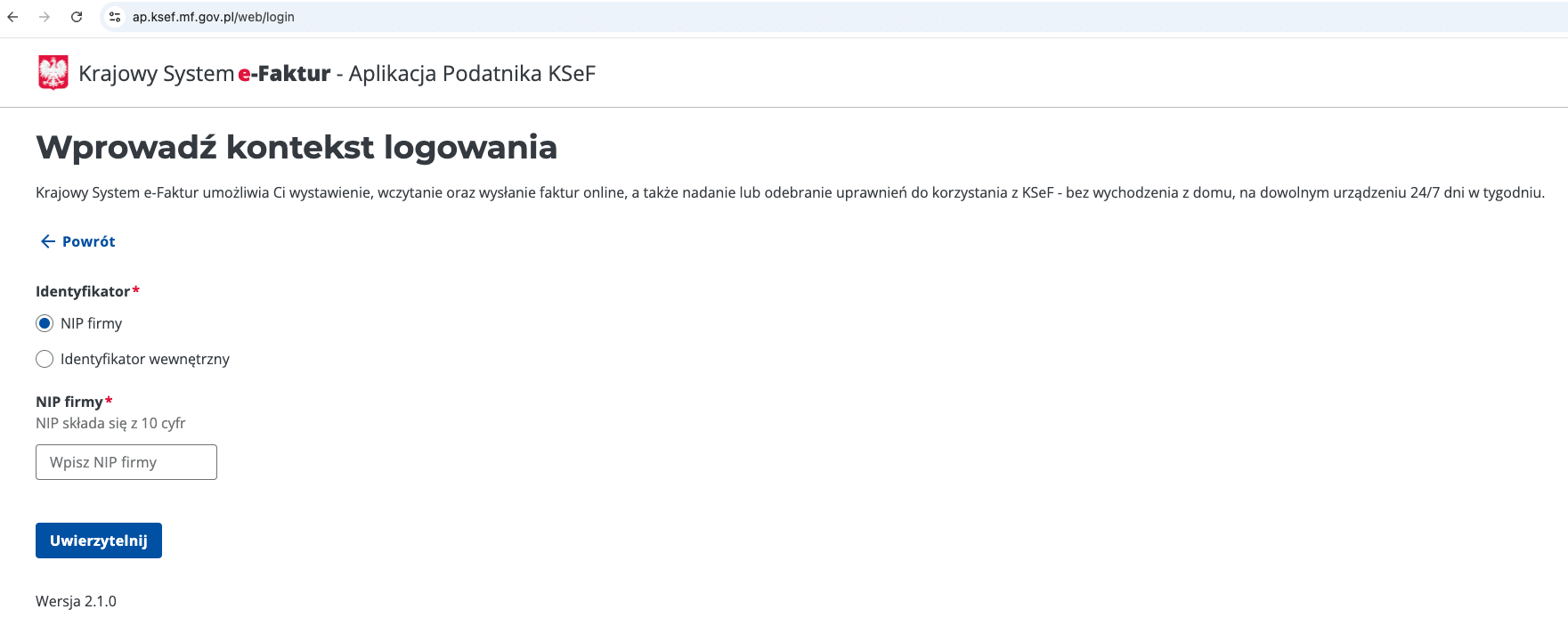 Wpisz NIP i kliknij „Uwierzytelnij”.