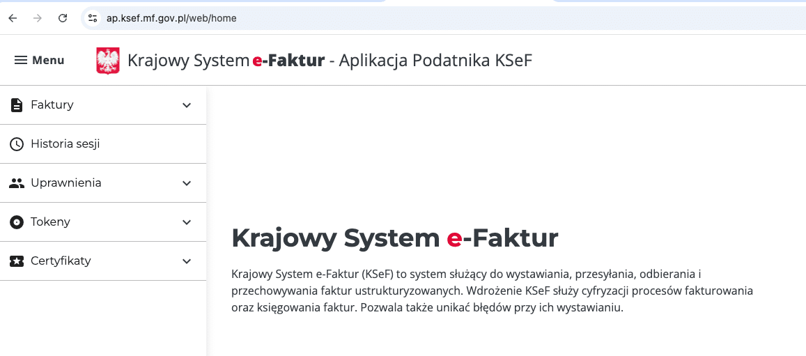Po lewej stronie pojawia się menu. Między innymi faktury, historia sesji, uprawnienia i certyfikaty.